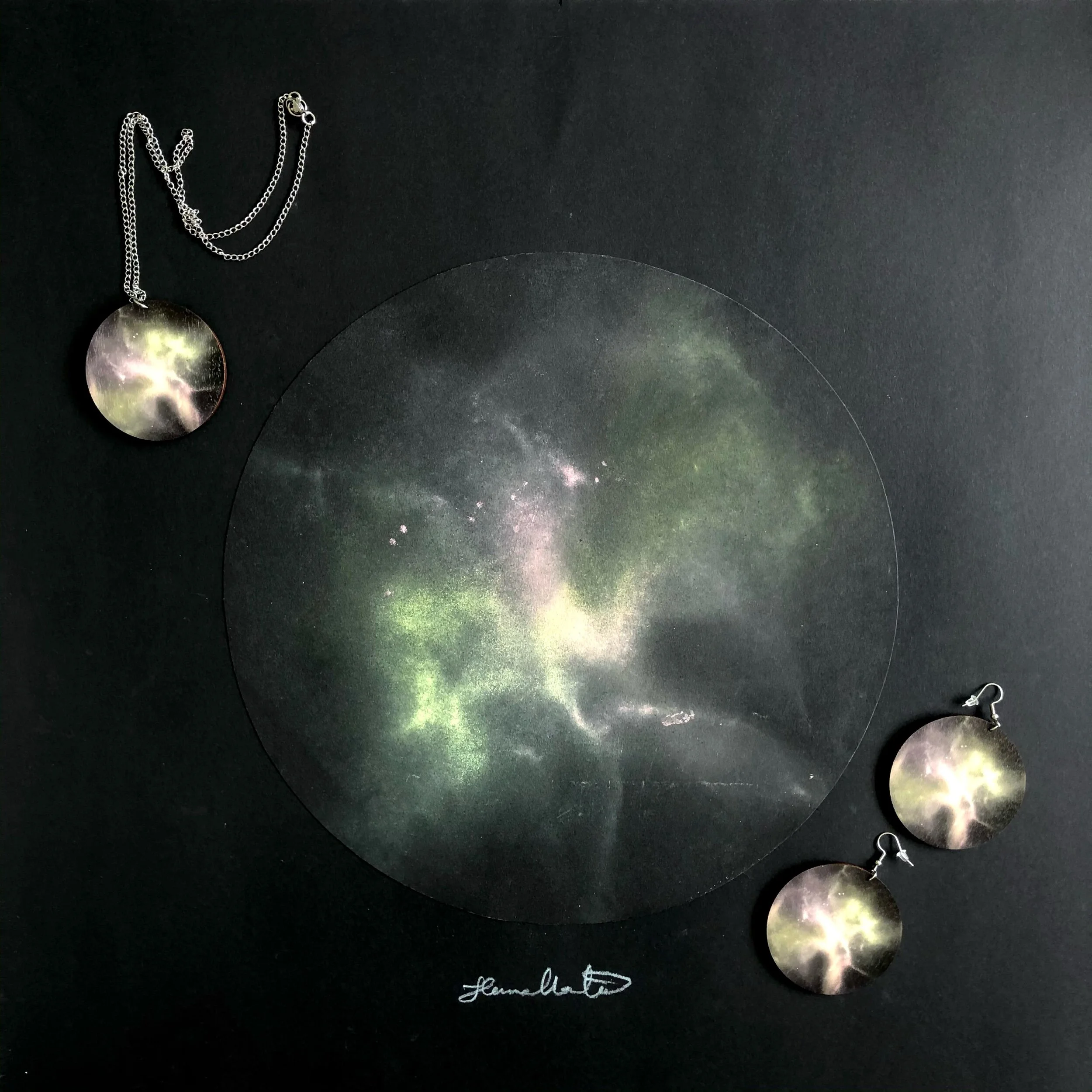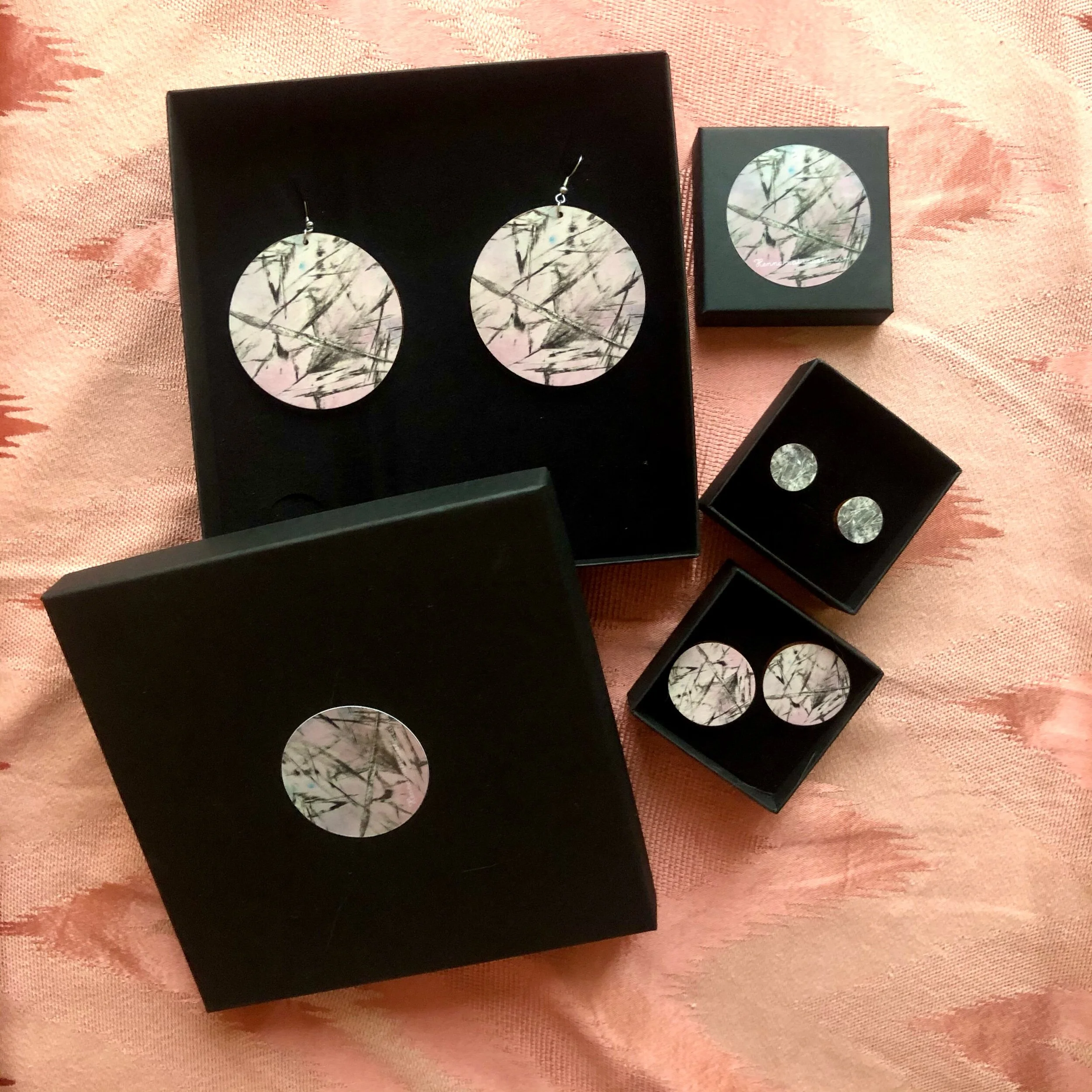 Alkuperäiset teokset on printattu puulle ja näin myös herkempi materiaali, kuten äänivärähtelyillä syntynyt jälki, on saatu toteutettua koruksi.